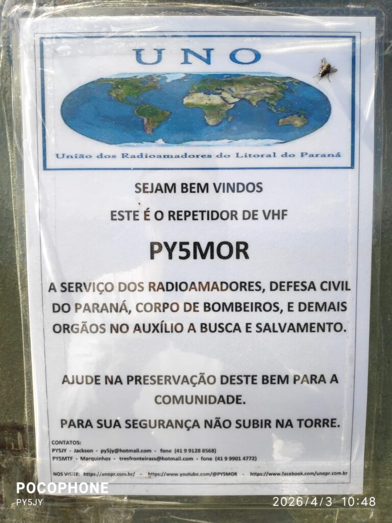 Segue algumas fotos enviadas pelo PY5JY, Jackson e o amigo Ruan, da manutenção da repetidora PY5MOR. Navegação de Post MANUTENÇÃO – PY5MOR – UNO – 03.04.2026