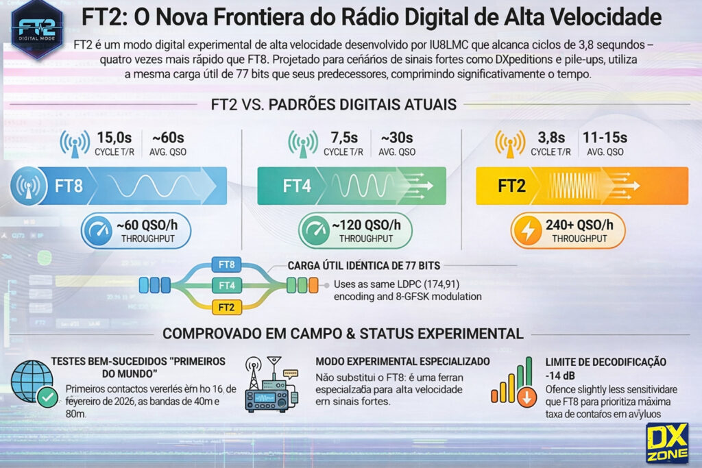 📡 Em 16 de fevereiro de 2026, um novo modo digital experimental chamado FT2 entrou em fase de testes on-air, completando com sucesso dezenas de contactos (QSOs) em ciclos ultrarrápidos de apenas 3,8 segundos, muito mais rápido que os modos FT8 e FT4 já consagrados na comunidade de radioamadorismo.