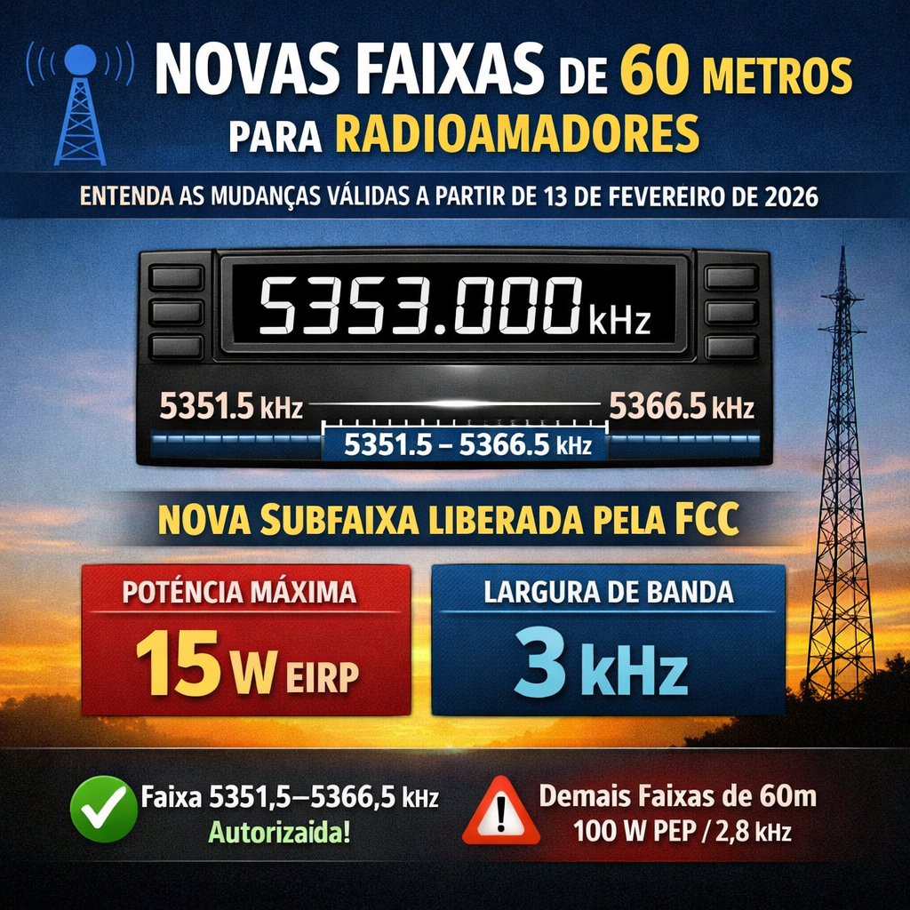 A Federal Communications Commission (FCC) dos EUA publicou mudanças na alocação de 60 metros que entram em vigor em 13 de fevereiro de 2026. A ação implementa, na prática, a alocação internacional aprovada na Conferência Mundial de Radiocomunicações de 2015 (WRC‑15). A medida cria uma subfaixa nova e impõe limites de emissão e potência que variam conforme o segmento do espectro.